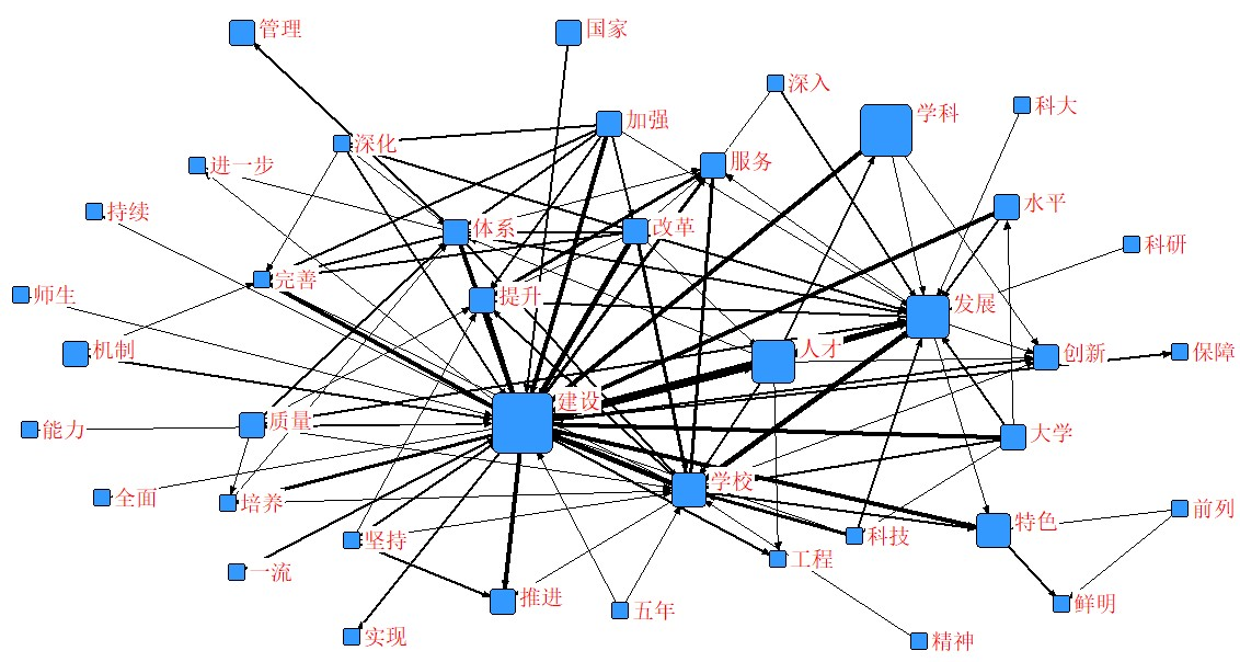 通过图1的词云图可以看出,建设、学科、发展、人才、特色、治理等词汇是大会报告中权重较大的,关键词词云图分析结果比较充分地展示了公司党代会报告的核心概念。