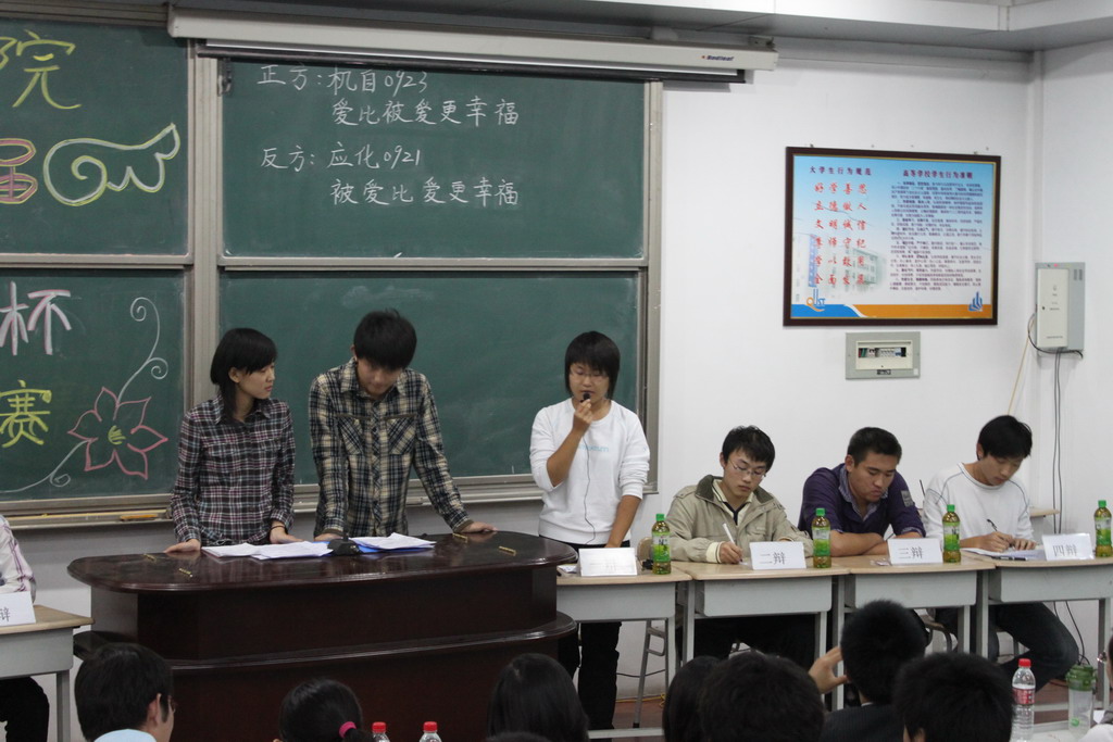 辩论赛分陈辞、攻辩、自由辩论和总结陈辞四个阶段。主持人宣布辩论赛正式开始后,正反双方就“爱与被爱那个更幸福”这一辩题展开激烈辩论。正方机自0923班旁征博引,立论有据,立场鲜明的指出爱是付出,也是享受幸福的过程;反方应化0921班则根据对幸福的含义的理解进行强烈反驳,指出只有当别人来爱你时你才会感到真正的幸福。正反双方立论思路清晰,逻辑严密,精彩的陈述赢得大家阵阵掌声。自由辩论环节,双方辩手你来我往,针锋相对,场上气氛达到高潮。精彩的辩论也引导这现场观众思考,爱与被爱到底哪个更幸福?最终,正方机自0923班以微弱优势获胜。精彩的辩论充分展示了辩手们广博的知识和敏捷的思维。