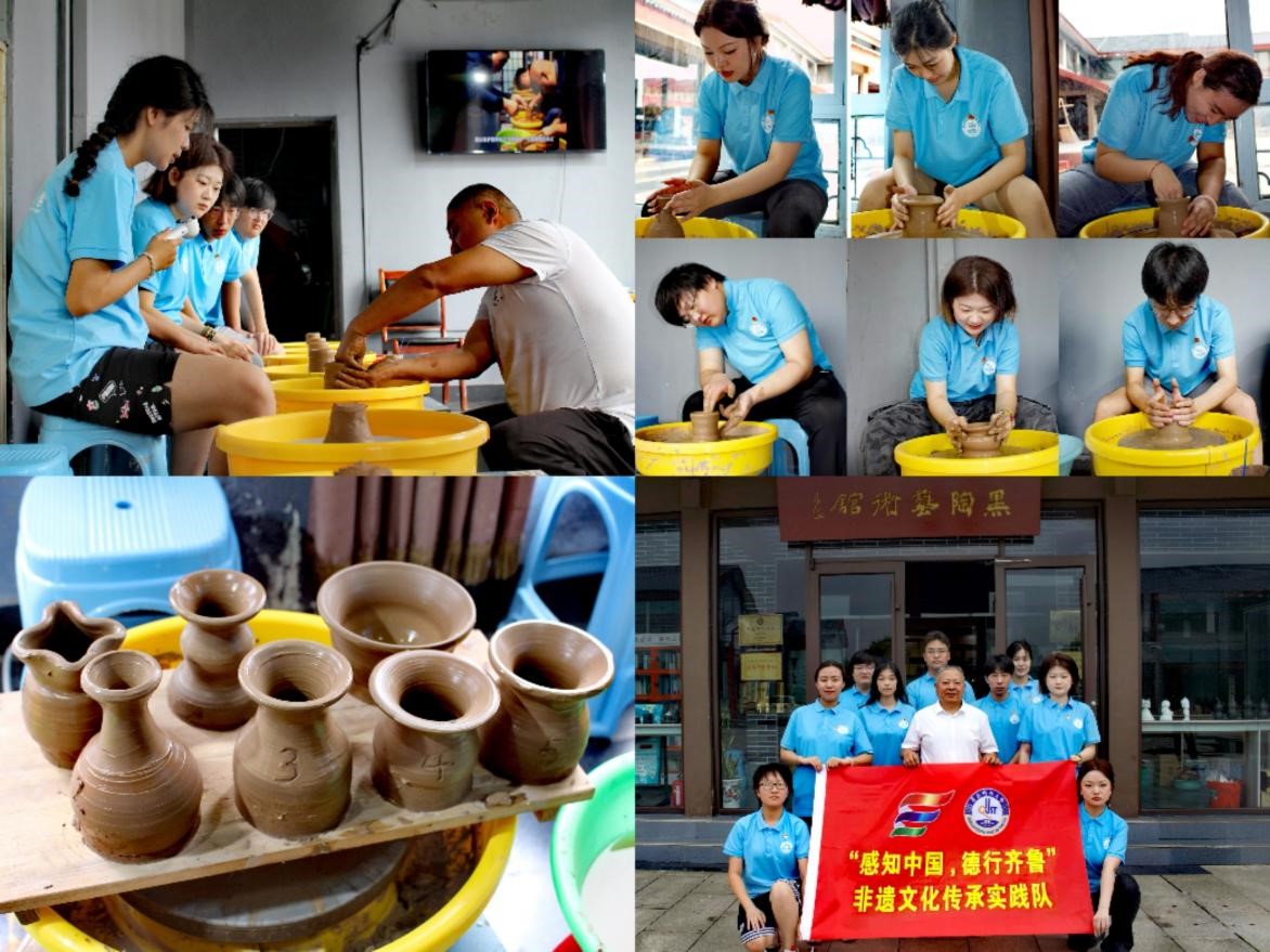 实践队一行首先来到了孔子六艺文化园内的黑陶艺术馆。在胶州蛋壳黑陶非遗传承人刘锦波的细致讲解下,队员们深入了解了黑陶的起源、制作工艺和文化内涵。通过现场近距离观赏蛋壳杯等黑陶手工艺品,使队员们真切感受到传统技艺与现代文化的交相辉映、相得益彰。在老师的指导下,队员们亲手体验将泥块放到成型机上,拉胚、修胚的制作过程,细细感受精心雕琢、耐心打磨的不易,心中满怀对匠心守护的崇敬之情。这一过程,不仅让队员们受到了传统文化的熏陶,更增长了他们对非遗保护重要性的认识。