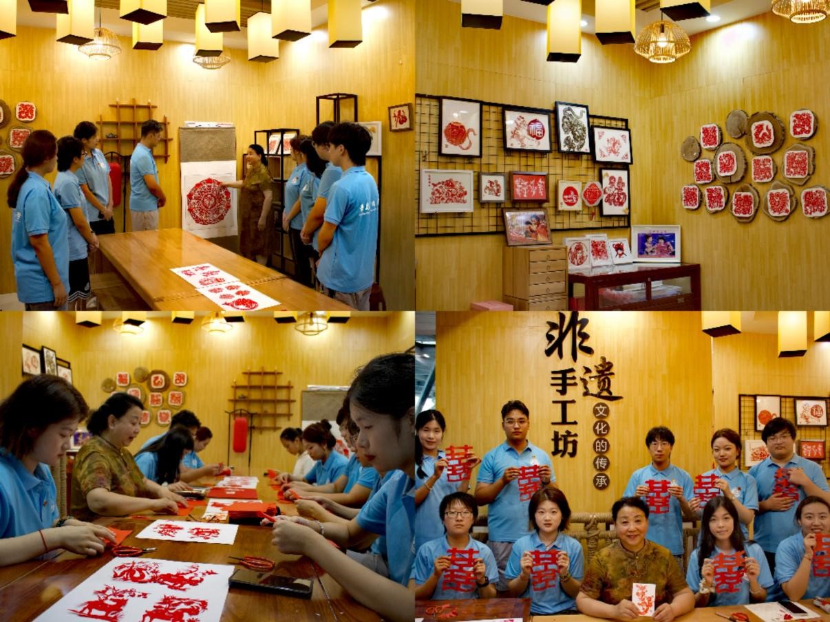 最后,实践队走进文化馆剪纸厅,种类多样的剪纸艺术品让队员们目不暇接。在胶州剪纸代表性传承人董丽霞的介绍下,队员们对剪纸的历史渊源、剪纸技巧和创意表达有了全面认识,不时在本子上做着记录。他们惊奇地发现,一张剪纸能够包含风土人情、民间故事等诸多内容,仿佛在诉说着亘古至今的动人故事,承载着时代的烙印。在深入体会剪纸的丰富内涵后,队员们在董丽霞的指导下,尝试亲自动手剪出“囍”字,“纸上生花”的技艺精髓得以窥知一二。剪纸作品中蕴含的风土人情、民间故事等元素,也让队员们深刻感受到了非遗文化与满足人民群众美好生活需求之间的紧密联系。