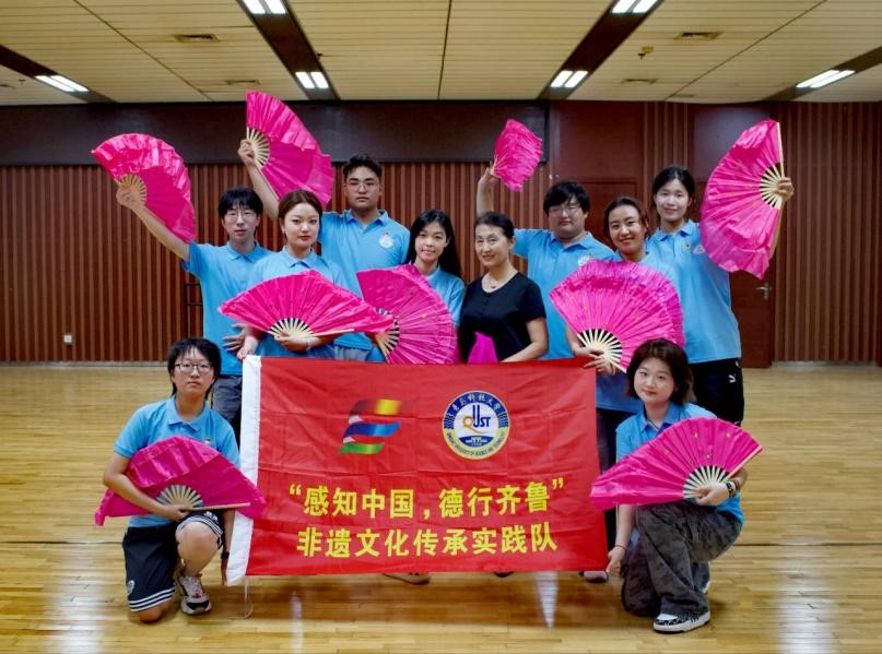 随后,实践队来到胶州市文化馆,对国家级非遗胶州秧歌进行调研、学习。秧歌起源于清朝乾隆年间,最早由民间小调发展而来,2006年胶州秧歌被列入第一批国家级非物质文化遗产名录,成为我国民间舞蹈的重要代表。胶州秧歌第七代传承人、原胶州市文化馆副馆长、副研究馆员,中国舞蹈家协会会员吕文斌亲自为队员们讲解、示范秧歌动作,从简单的踏步到复杂的转身,队员们认真模仿“三弯九动十八态”的柔美韵味,努力诠释着对秧歌的见解,体会秧歌的独特魅力与文化价值。为了更加准确地还原标准动作,队员们现场录制了教学视频,以备后续科普宣讲时反复模仿练习。通过亲身体验,队员们不仅感受到了胶州秧歌的独特魅力和文化价值,也深刻认识到了传承非遗文化对于弘扬民族精神、增强文化自信的重要意义。