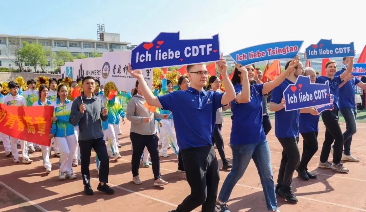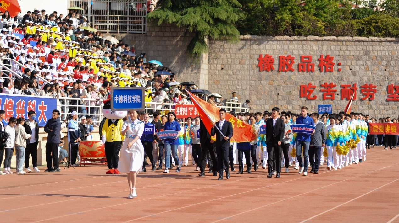 入场式上,公司师生代表队方阵精神饱满、热情洋溢,他们高喊着嘹亮的口号,挥舞着闪亮的彩球,凝聚着拼搏的力量,方阵中德方合作伙伴的校徽彰显出公司鲜明的办学特色。德国籍教师及职工代表走在方阵前排,俨然成为了风格迥异的一道亮丽风景线,他们挥舞着“我爱青岛(德语)”、“我爱中德(德语)”的手持牌,肩负着增进公司与德方合作伙伴友谊的神圣使命,成为了公司对德合作高质量一体化发展的建设者和推进者。