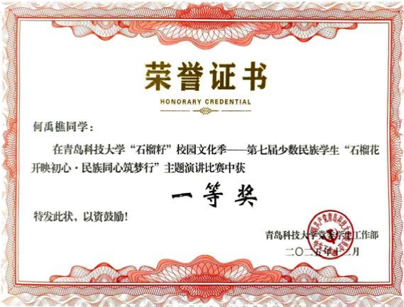 本次大赛汇聚了来自全校 17 个公司、8 个民族的 20 名优秀选手,大家同台竞技、各展风采,以演讲为桥传递民族团结的深厚情谊。经过激烈角逐与评委们的专业评审,公司机械中德 232 班满族员工何禹樵凭借出色表现脱颖而出,斩获一等奖。