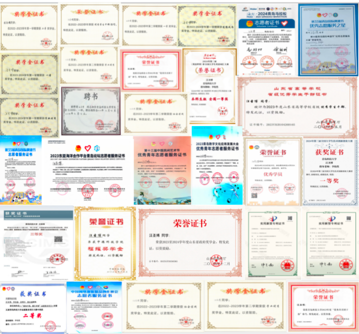 为学之实,固在履践,利用课余时间他加入实验室探寻专业发展的前沿动态,走入企业工厂实习将专业知识落地转化,在学以致用的过程中不断增强自身对专业的认识,目前已发表2篇学术论文并主持山东省老员工创新创业训练计划1项。在学习与科研实习过程中,他以竞赛的方式验证对专业的理解,获国家级奖项3项,省部级奖项7项。