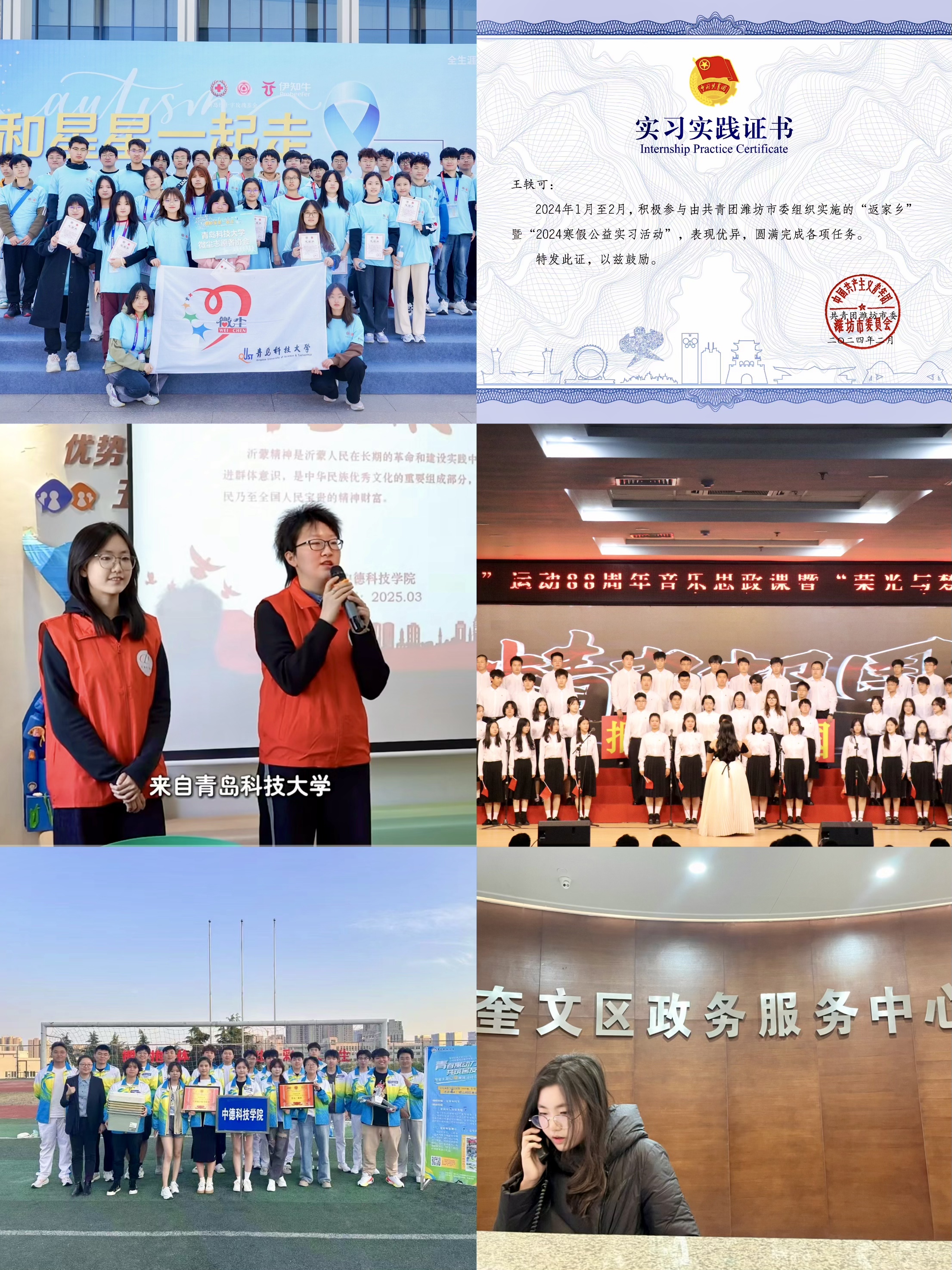 实践砺行,肩承使命。在实践探索的道路上,她始终秉持知行合一的理念。寒暑交替间,她先后投身潍坊市行政审批服务局的政务实践,深入农村开展“三下乡”调研。在“青鸟计划”政务实习期间,她扎根潍坊市行政审批服务窗口,以专业和热忱服务每一位办事群众,累计接待咨询办理300余人次,参与优化两项便民服务流程,这份为民服务的初心与实干让她荣获“潍坊市优秀实习生”称号。