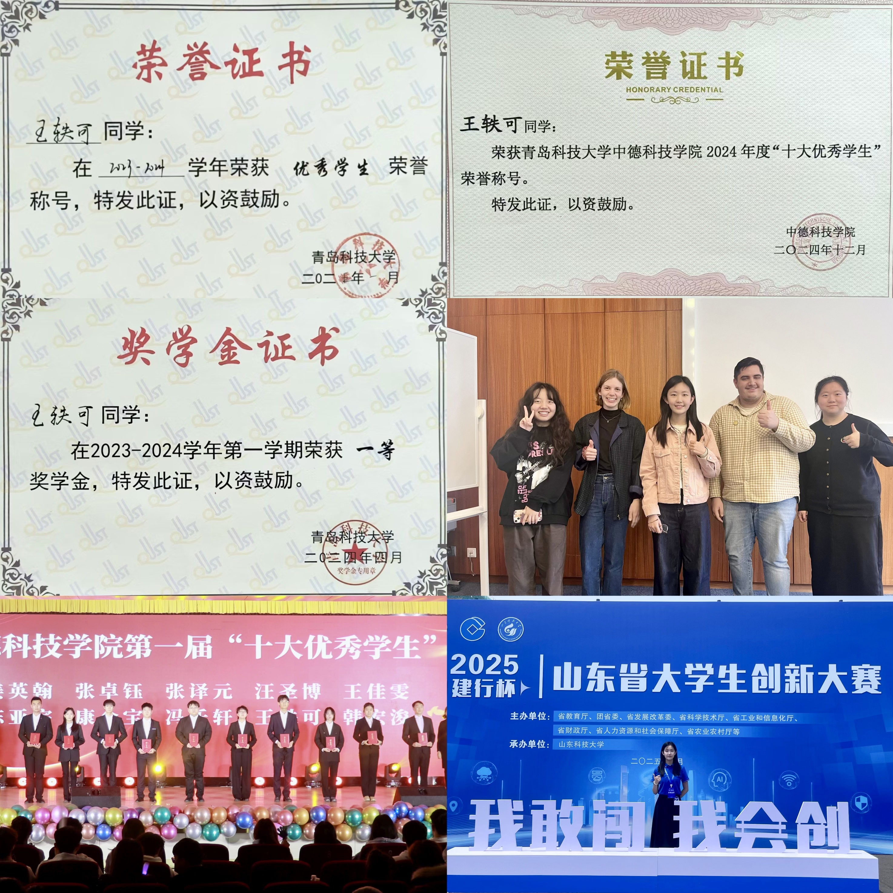 作为班级学习委员,她始终以认真负责的态度对待每一项工作。她严于律己,不仅自己刻苦钻研专业知识,更主动化身“学习引路人”。她系统地完成了10余门核心课程的学习,成绩优异,其中专业主干课均在85分以上,综测成绩位于专业前3,连续多次获得校级奖学金,获得中国国际老员工创新大赛省金等多项荣誉,以自身的优异表现为同学们树立了榜样。语言学习方面,她以坚定的学习热忱投身德语专业学习,系统钻研德语语法、文学与文化课程,通过课堂研讨、原版文献精读和德语戏剧实践,逐步构建起扎实的语言体系。与此同时,她顺利通过英语四级考试,为自身搭建起更为广阔的国际交流桥梁。