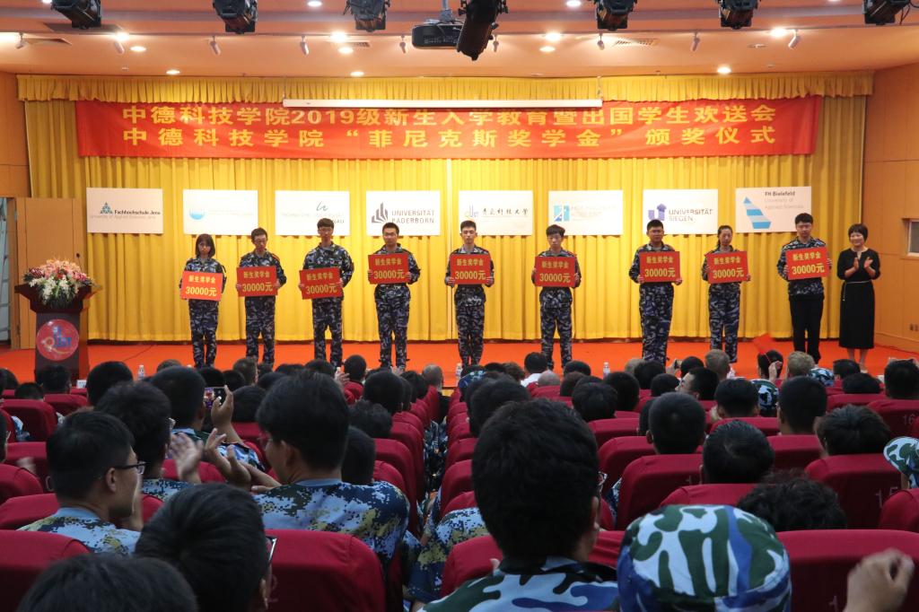 集团组织部正处级组织员兼机关党工委常务副书记、副部长秦姣、教务处副处长张树海为获新生奖学金的2019级新生颁奖。宣传部副部长李鲲鹏、统战部副部长魏琳、校团委副书记张玉、国际处副处长王灏、后勤处党总支副书记崔鹏分别为出国员工颁发了录取通知书。