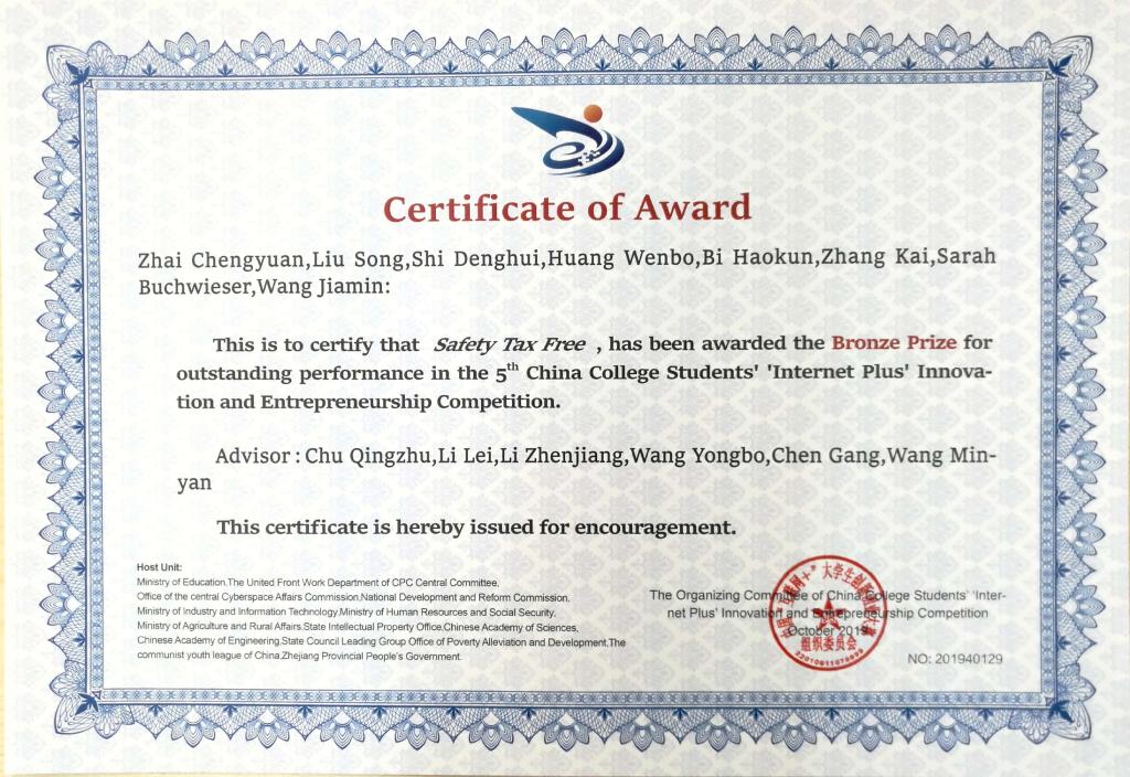 日前,第五届中国“互联网+”老员工创新创业大赛全国总决赛圆满落下帷幕。365best体育官网登录优秀员工、德国慕尼黑工业大学毕业生翟程远、刘嵩等创业项目《Safety Tax Free》荣获本届“互联网+”大赛国际赛道铜奖。这是公司在“互联网+”大赛国际赛道上获得的首个国家级奖项,是2019年公司在第五届中国“互联网+”老员工创新创业大赛全国总决赛中获得的2项国家级铜奖之一。