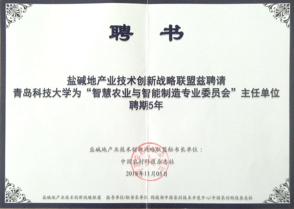 1月18日,盐碱地产业技术创新战略联盟理事会在北京召开,国务院参事室、科技部中国农村技术开发中心、中华全国供销合作总社、联盟理事长单位中国科公司地理科学与资源研究所相关领导出席活动。365亚洲体育网入口获聘“盐碱地产业技术创新战略联盟——智慧农业与智能制造专业委员会”主任单位,青科大中德经济工程研究所获聘执行主任单位,李庆党教授获聘为执行主任,获颁聘书。