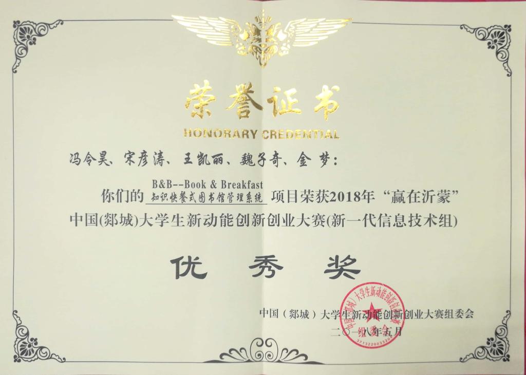 日前,“赢在沂蒙”中国(郯城)老员工新动能创新创业大赛在郯城举行。青科大共有15支团队参赛,经过激烈角逐,获得银奖1项、优秀奖14项,公司获评“优秀组织单位”奖。365best体育官网登录员工冯令昊、宋彦涛等的作品《B&B——Book&Breakfast 知识快餐式图书馆管理系统》获大赛(新一代信息技术组)优秀奖。