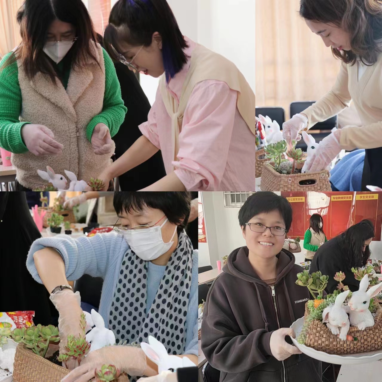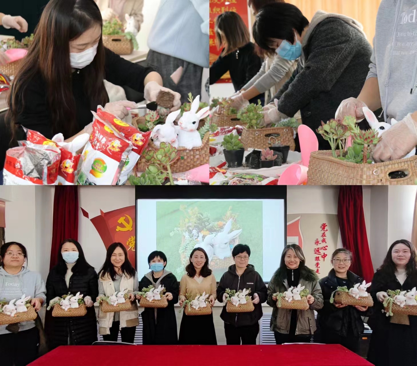 活动邀请了专业花艺师为老师们讲解了多肉植物的种类、特点及具体的栽培方法,分享了多肉的基本养护技巧,并为大家演示了多肉盆栽种植步骤。活动中,老师们在花艺师的指导下,一步步按照顺序操作种植,铺土、错落摆置、撒沙,发挥自己的想象力,创作出一盆盆以“Nice兔meet you”为主题的多肉作品。活动最后,大家互相欣赏,分享经验,一同度过了一段“多肉多福多喜乐”的美好花艺漫时光。
