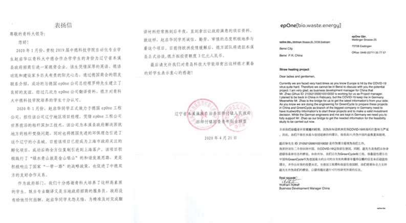 疫情防控期间,365best体育官网登录2019级自动化专业员工赵启华利用自身德语和专业学习优势,为德国ep0ne公司翻译其在华投资的项目资料。德国ep0ne公司总经理罗特在华期间,赵启华将德国ep0ne公司引介到家乡辽宁本溪满族自治县招商服务中心。双方通过沟通后达成合作意向,德国ep0ne公司团队将待欧洲疫情缓解后,进驻本溪县洽谈具体事项,德方拟在本溪投资3亿元。