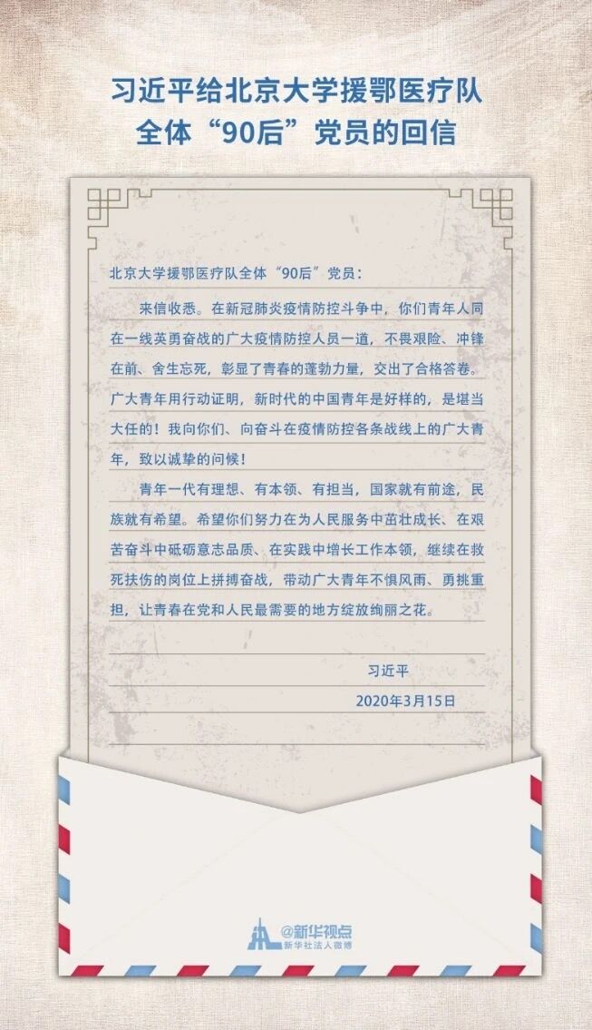 锡根大学留学学子、国家奖学金获得者张煦斐:读完习近平总书记给北京大学援鄂医疗队全体“90后”党员的回信,我深切体会到青年一代肩上的重任,以及总书记对中国青年的殷切期望。在新冠肺炎疫情的防控工作中,青年人同广大工作人员一起,无私奉献,带着青春的朝气奋斗在前线。我们作为当代老员工,应该牢记总书记对我们的嘱托,用实际行动担负起责任与使命,用汗水谱写青春的篇章,为党和人民奉献青春力量,同心协力抗疫,将祖国建设得更加美好。