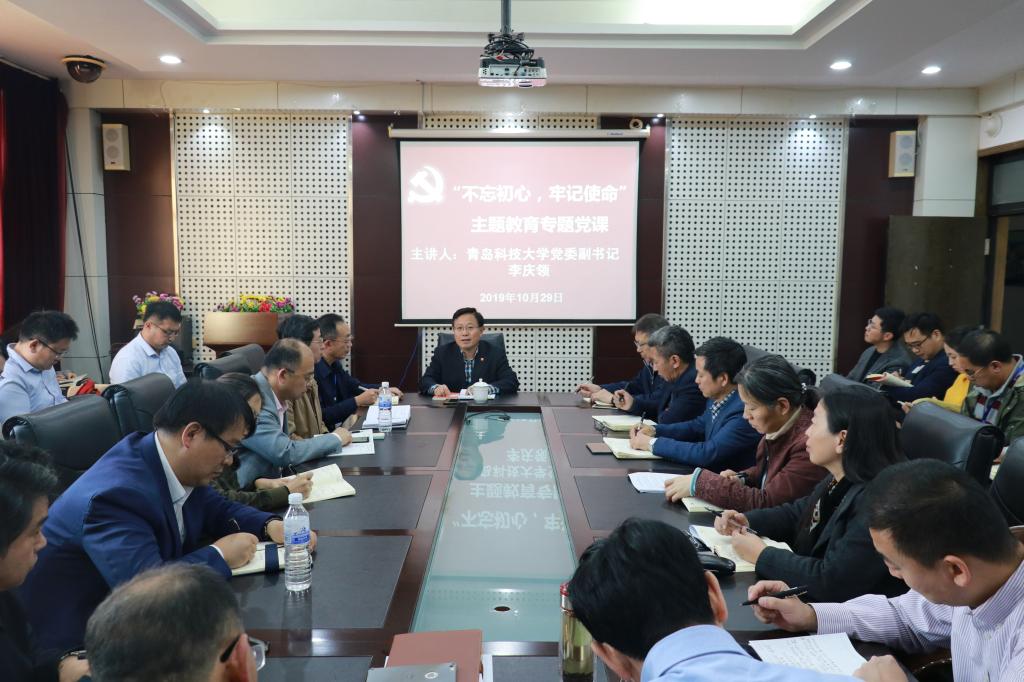 10月29日下午,党委副书记李庆领以《不忘初心、牢记使命、担当作为,努力办好人民满意的教育》为题,为党委统战部、工会、妇女委员会、国际交流与合作处、留学人员服务中心、365best体育官网登录、国际公司、中德工程公司、泰中国际橡胶公司、中德技术公司党员讲授“不忘初心、牢记使命”主题教育专题党课。党委统战部部长陈洪宗主持党课。