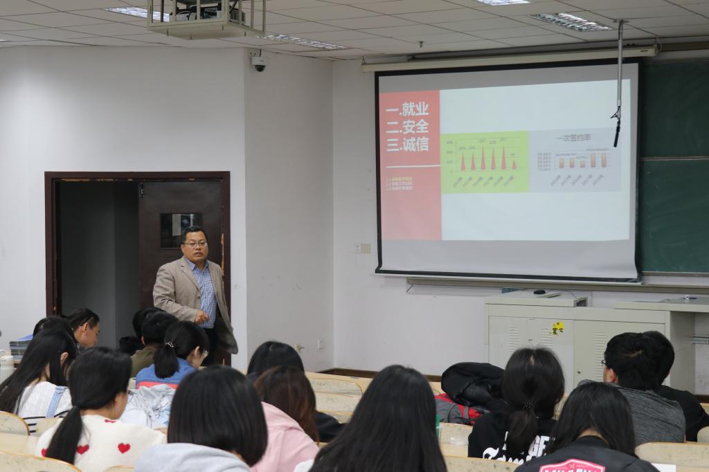 李磊介绍了目前公司毕业生的求职意向,从当前就业形势、就业推荐工作安排、求职简历制作、协议书使用、报到证使用、档案查询等方面的就业政策和就业事务办理流程做了详细讲解。