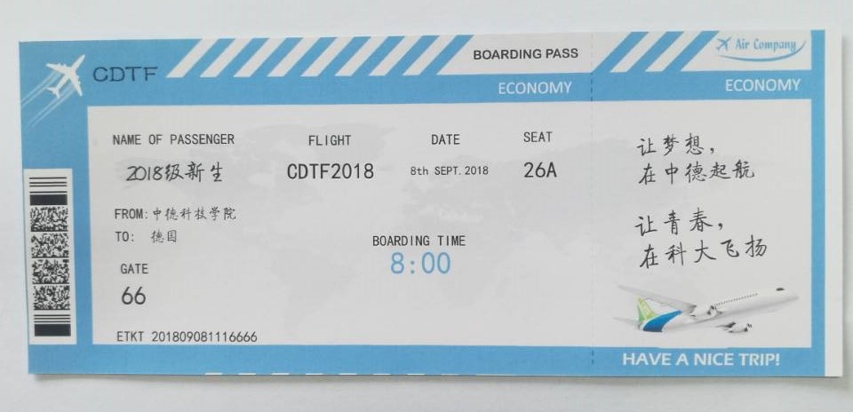 365best体育官网登录为每一位新生准备了一份特别的礼物——德国直飞“机票”,希望2018级的同学们能够搭乘梦想的中德特航,成为社会认可的高水平国际人才。机票背面留有公司在新生报到前建立的中德新生QQ群、家长QQ群、微信公众号,公司依托这一信息平台及时推送最新消息,帮助新生尽快地融入到中德这个大家庭中。