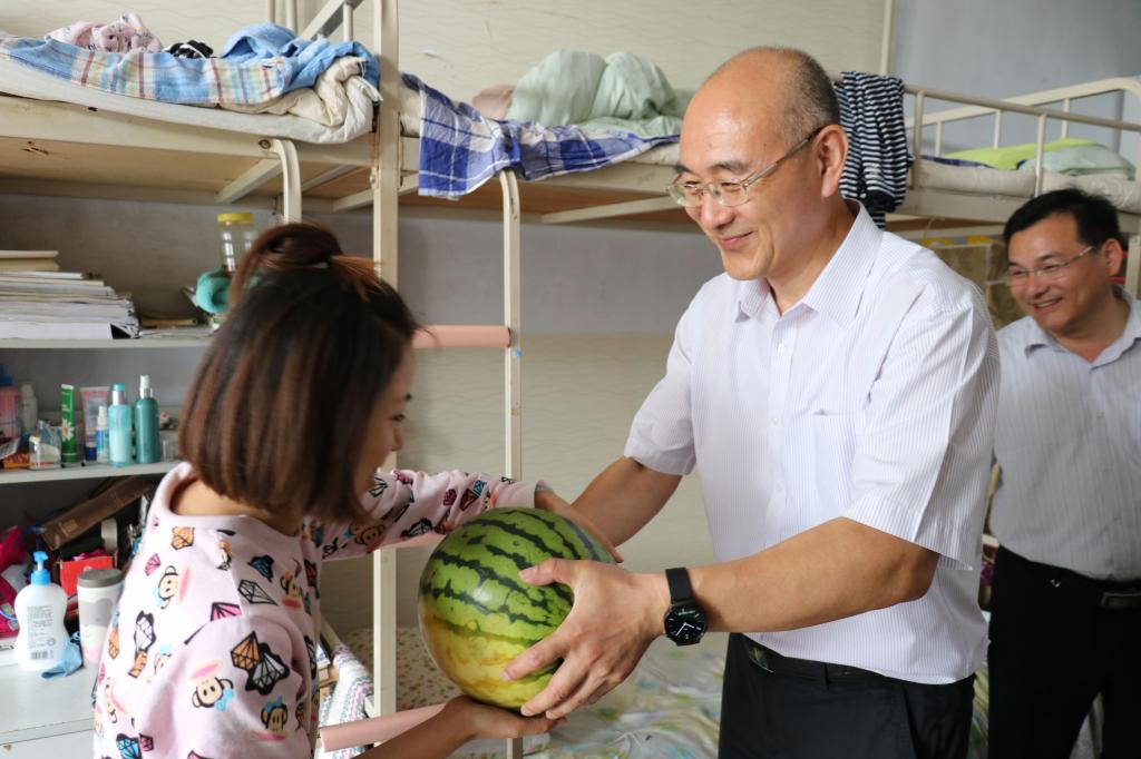 陈克正一行先后来到崂山校区南区9号楼部分毕业生宿舍,为毕业生送去西瓜,亲切地与毕业生进行交谈,仔细询问他们的毕业去向以及论文答辩、离校前准备情况。公司2017届毕业生同学热情邀请领导走访自己的宿舍,主动向领导汇报自己四年来取得的成绩,对公司公司领导的关心表示感谢,并表达对母校的美好祝愿。