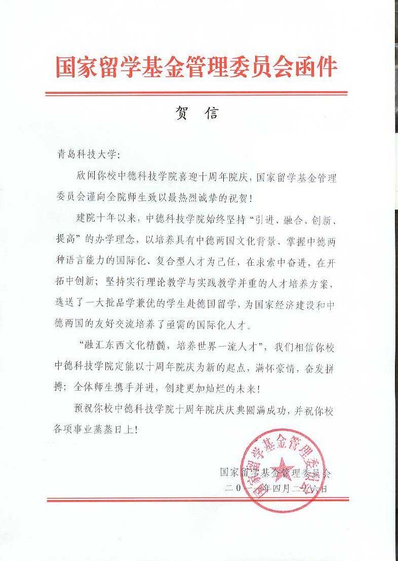【中德公司十周年院庆】国家留学基金管理委员会为365best体育官网登录十周年院庆发来贺信
