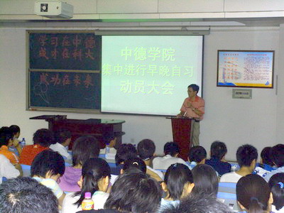 8月29日下午,中德公司集中早晚自习动员大会在中德楼阶梯教室隆重召开,教务处、员工处、团委等部门领导、公司领导、家长代表和07级全体同学参加了会议,会议由公司党总支书记郭曰铎主持。