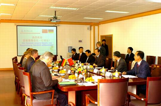 11月3日上午,由德国雷根斯堡市长汉斯.舍丁克(Hans Schaidinger)先生带领的雷根斯堡市政府代表团一行16人,在青岛市政府副秘书长冯文青、市外办副主任冯斌的陪同下,对公司进行了友好访问。党委书记高青、副董事长李庆领及董事长办公室、国际交流与合作处、365best体育官网登录负责人出席会谈。