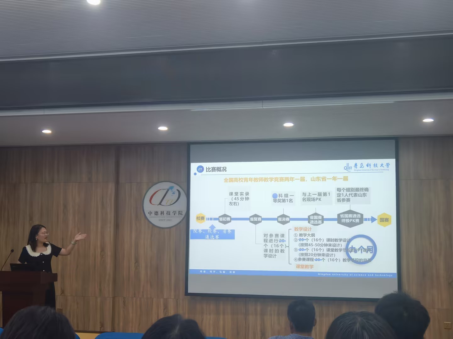青年教师教学竞赛培训活动中,“山东省第十一届高校青年教师教学比赛”一等奖获得者蓝岩真进行了经验分享。蓝岩真以其丰富的参赛经验和深厚的专业素养,从比赛概况、评分标准到个人感悟与体会等多个维度,全面细致地阐述了青年教师在备赛过程中需要关注的关键点。她特别强调了赛前准备与临场发挥的重要性,尤其是精心准备教学材料对于提升比赛表现的关键作用。她还从心理调适的角度,为青年教师们提供了宝贵的建议,帮助他们以更加平和与自信的心态面对竞赛挑战。