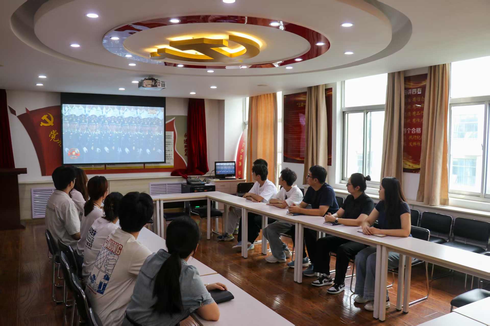 大会开始前,师生代表整齐就座,当80响礼炮响彻云霄,全场师生起立高唱国歌,嘹亮的歌声与直播画面中天安门广场的升旗仪式交相辉映。师生们认真聆听习近平总书记重要讲话,回顾中国人民抗日战争的光辉历程,感受中华民族不畏强暴、血战到底的英雄气概。当受阅部队以威武雄壮的姿态通过天安门广场时,现场爆发出阵阵热烈掌声。