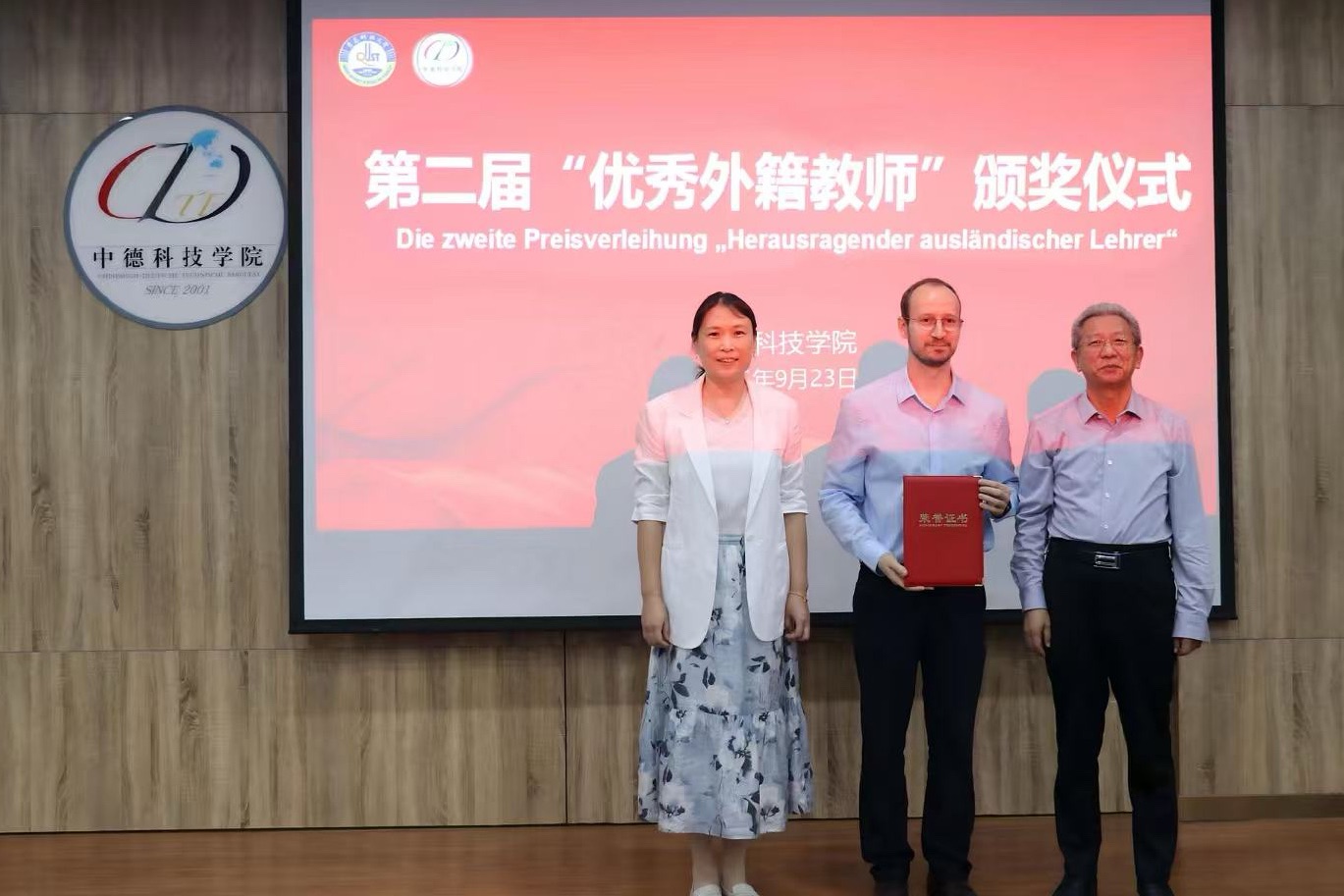 岳学海、韩海青依次为第二届“四有” 好老师、“优秀外籍教师”获奖代表颁发荣誉证书。