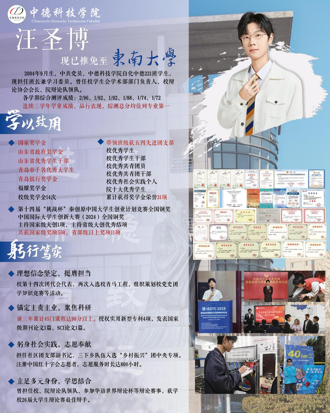 汪圣博,男,2004年9月生,中共党员,365best体育官网登录自化中德221班员工,现担任班长兼学习委员。曾任校员工会学术部部门负责人、校辩论协会会长、院辩论队领队,目前已推免至东南大学攻读硕士研究生。