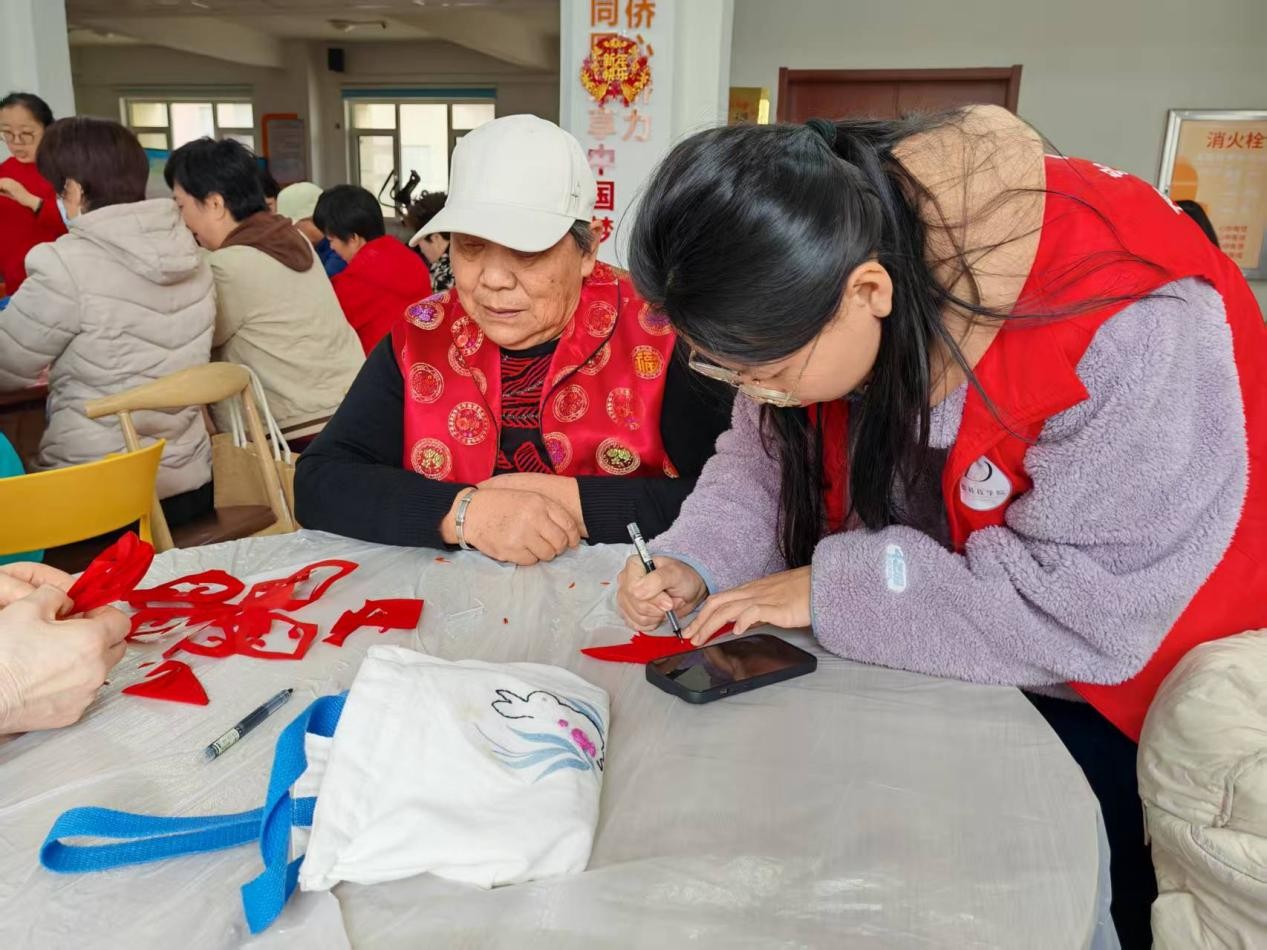 活动现场,剪纸非遗教学氛围温馨而有序。志愿者们提前准备充分,携带剪刀、彩纸等工具,系统讲解剪纸艺术的历史与技法。针对老年群体特点,精选福字、喜字等吉祥纹样,通过“手把手示范、分步骤指导”的方式,耐心引导老人们完成剪纸创作。老人们神情专注,积极交流探讨,现场洋溢着庄重而融洽的气氛。一幅幅寓意美好的剪纸作品在老人们手中诞生,让他们深刻体验到了非遗文化的独特魅力与动手实践的成就感。
