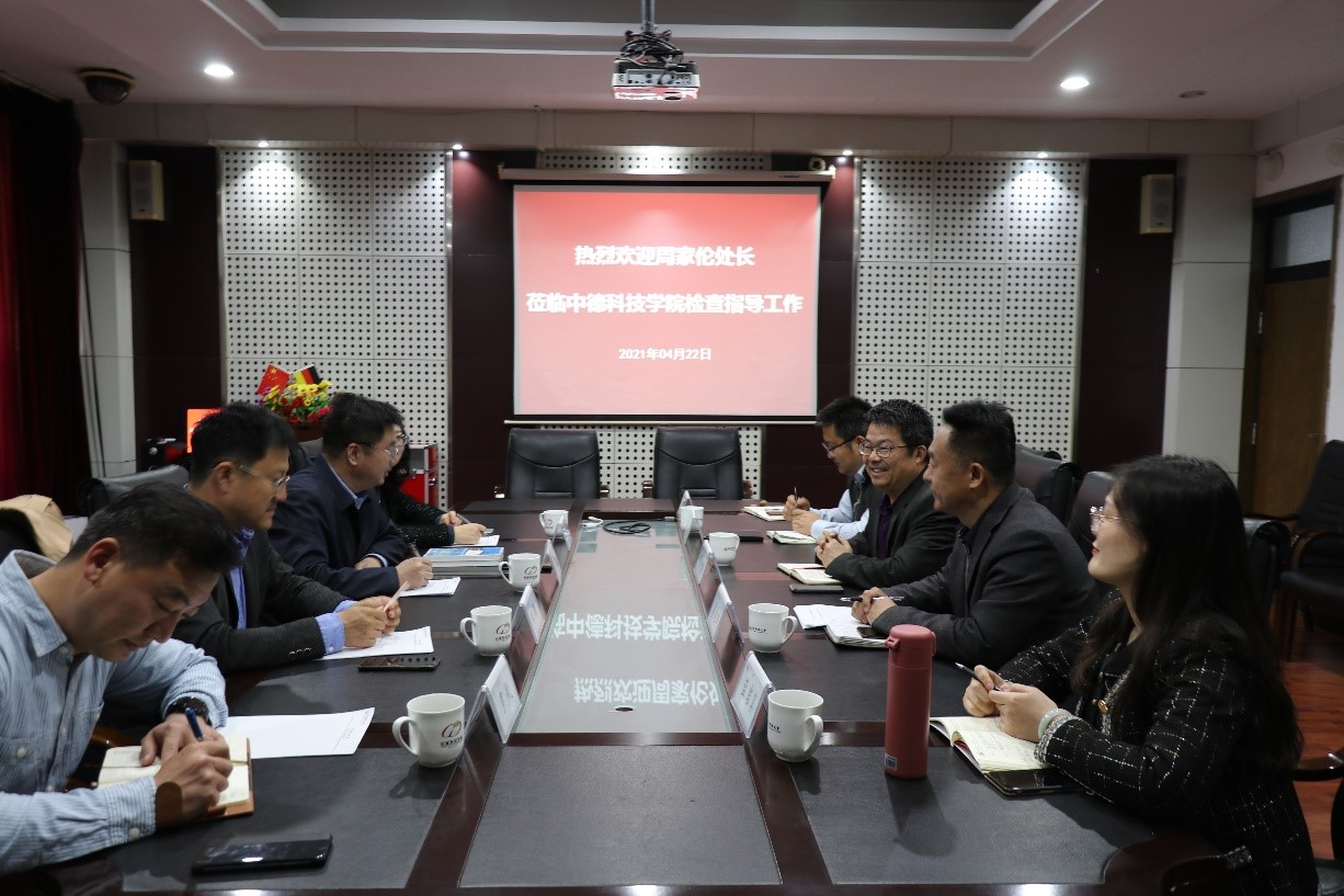 4月22日下午,山东省外办欧洲非洲处处长周家伦到访365best体育官网登录,公司国际交流合作处长王灏、副处长罗毅、中德工程公司副经理田春雨,365best体育官网登录经理李庆党、副经理郭建章、外事部、办公室及德语中心教研室相关负责人陪同调研走访。