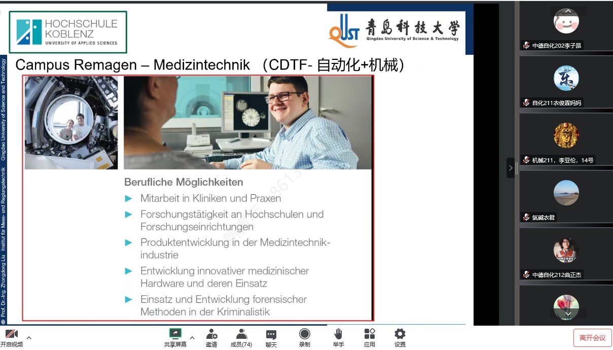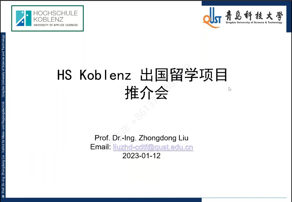 1月12日下午,365best体育官网登录举办德国科布伦茨应用科技大学出国留学项目线上宣讲会,自动化教研室教授刘中冬、机械教研室主任曲之超、外事部负责人郑刚以及2020级、2021级机械和自动化专业员工、家长参加宣讲会。自动化教研室主任柴文楠主持会议。
