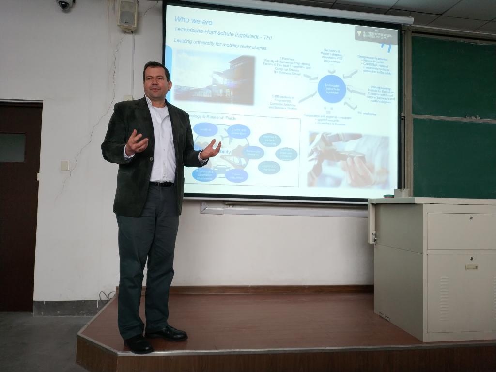德国TH Ingolstadt大学机械公司Jattke教授带领的师生团队,为公司2016级机械工程专业员工做了一场精彩的学术报告,简要介绍了TH Ingolstadt大学的情况,重点介绍了物流、供应链管理及全球化方面的最新状况、面临的挑战及发展趋势。