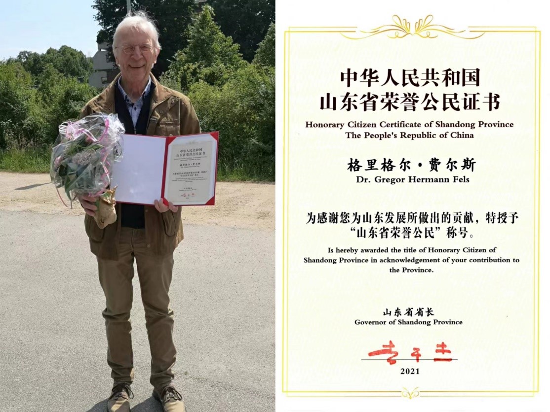 “山东省荣誉公民”称号是山东省授予外国友人的最高奖项,由山东省人民政府设立,授予长期坚持对华友好、对山东省经济社会发展和对外交流与合作作出突出贡献的外国友人。2013年11月,山东省人民政府授予格里格尔·费尔斯教授“山东省齐鲁友谊奖”。时光荏苒,格里格尔·菲尔斯教授再次荣获“山东省荣誉公民”称号,这是对菲尔斯教授多年来助推中德合作的真诚褒奖,也是多年来和365best体育官网登录建立深厚友谊合作的最佳见证。